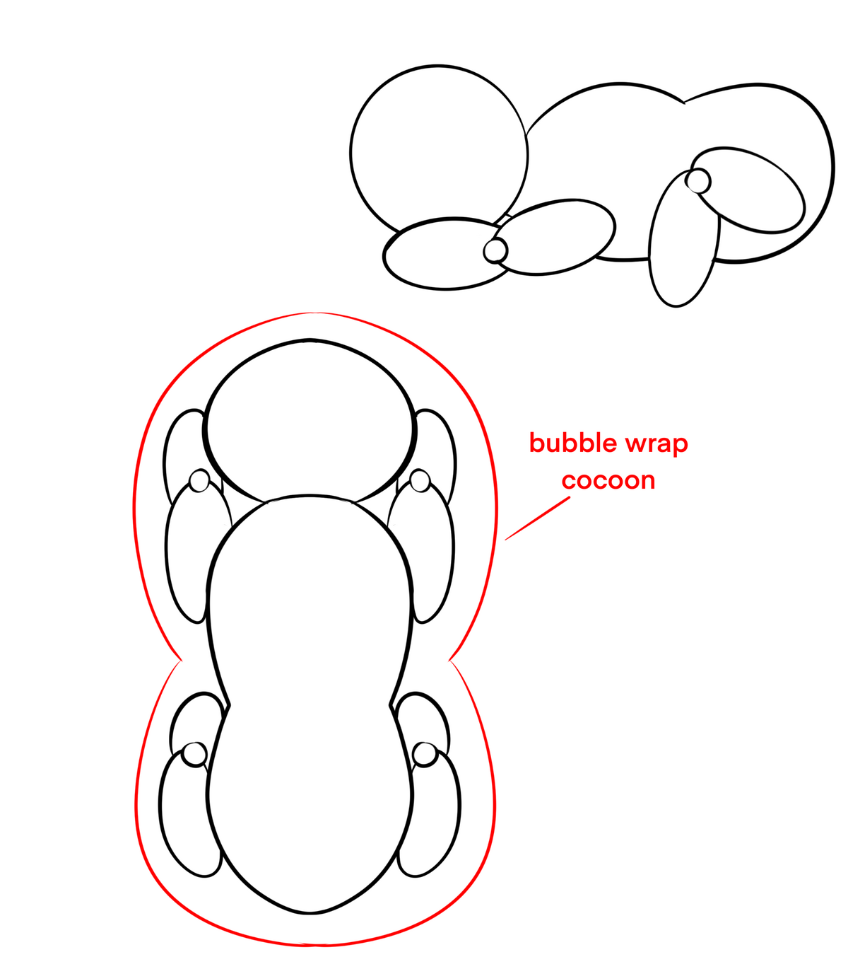Shown in the image below is the proper way to prepare a body for shipping. The head should be tilted down and both front legs out in front of the robot. The back legs should be folded like below. With legs against the body, wrap the robot in a thick cocoon of bubble wrap, akin to packaging glass. Reinforce the packaging if necessary, and make sure that you don't hear anything rattling around when you shake the box.